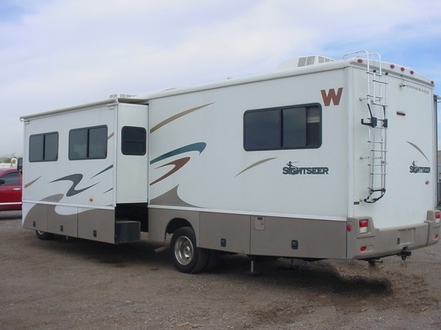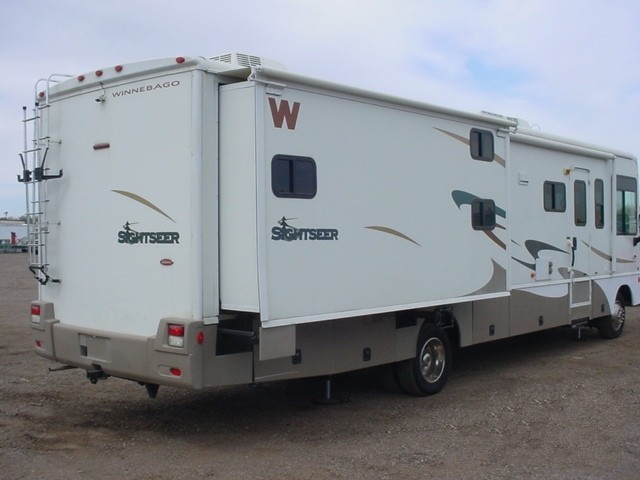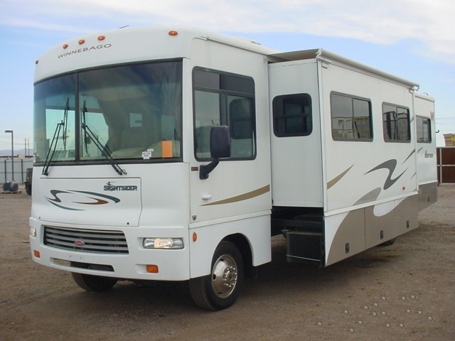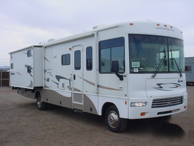 - Details : 35' Motorhome, Ford 6.8L V10 Engine, Automatic Transmission, Backup Camera, 2 Slides, Power Awning, Hydraulic Stabilizers, Sink, Stove Top, Microwave Oven, Refrigerator w/ Freezer, Toilet, Shower, Roof Top A/C Units, Stereo w/CD Player, Onan Marquis Gold 5500 Generator, 245/70R/19.5 Tires 26,227 Miles